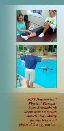 | Welcome to Sports Center Physical Therapy located at the Falmouth Sports Center on Cape Cod. SCPT has been providing out-patient physical therapy since 2000. We treat patients for a variety of pre- and post-surgical conditions. In addition, we are specialists in sports therapy, offer aquatic therapy, and have a licensed massage therapist in our clinic. We are a provider for most insurance companies, including Medicare. Please browse our website to learn more about our staff and philosophy, see photos of our clinic and facility, and download forms to get started with your initial evaluation. |